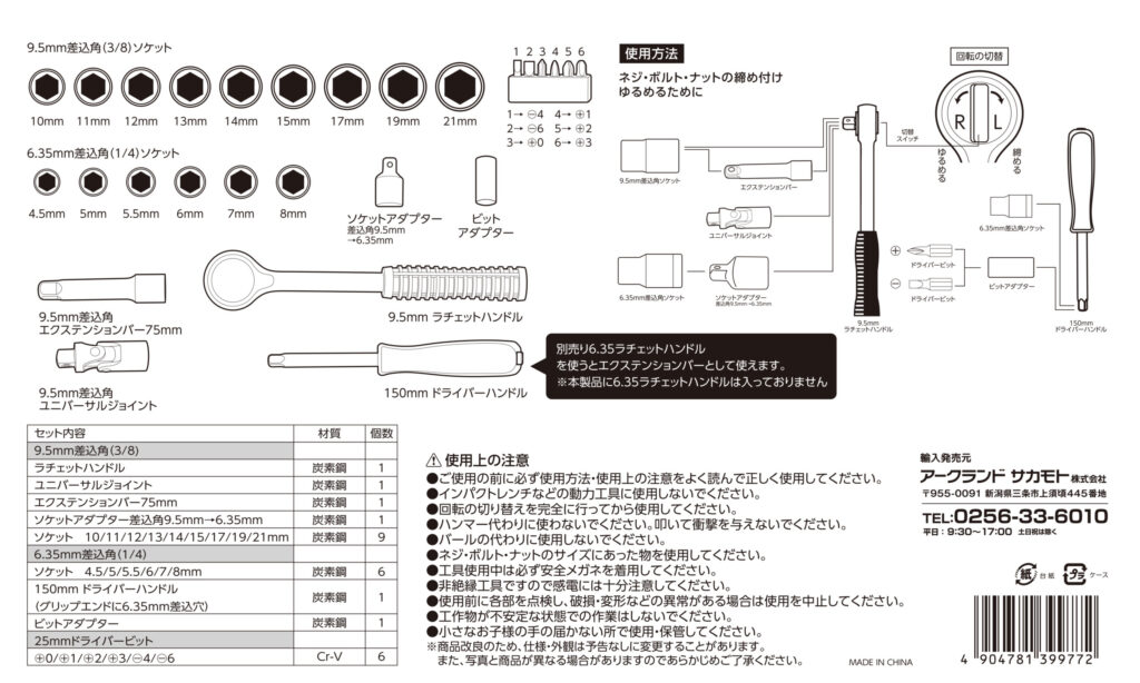 ソケットアダプター差込角9.5mm→6.35mm/ソケット 10・11・12・13・14・15・17・19・21mm