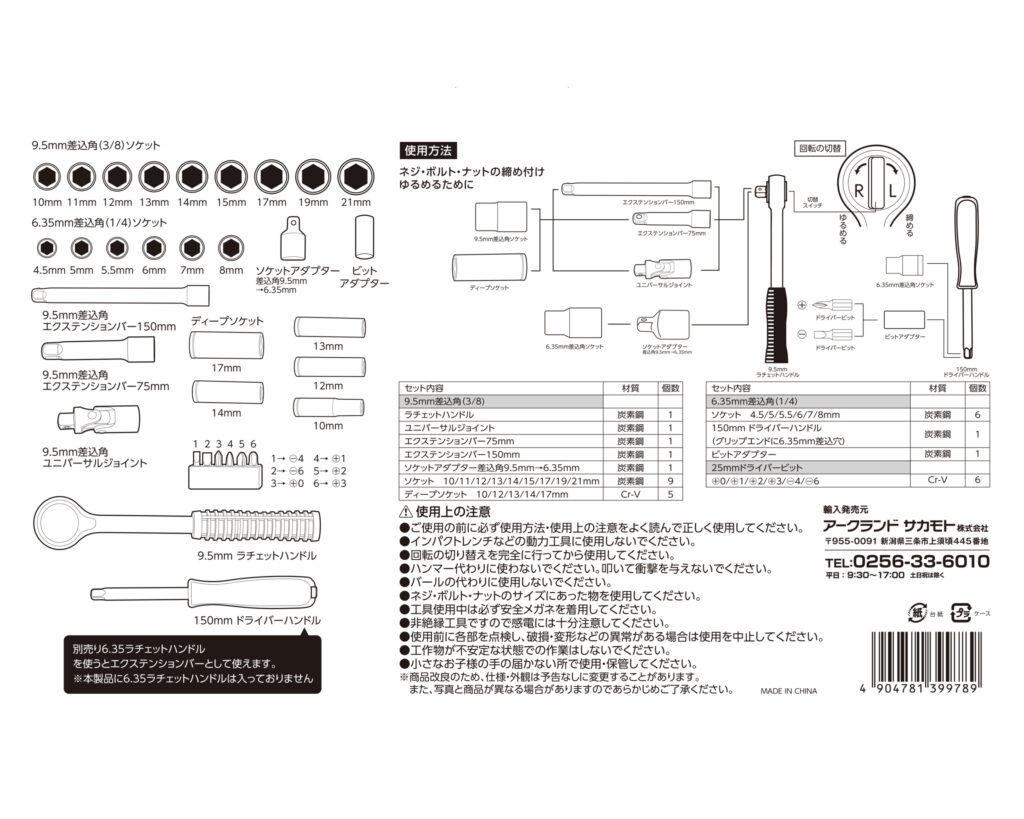 セット内容2:(6.5mm差込角[1/4])ソケット 4.5・5・5.5・6・7・8mm/150mmドライバーハンドル