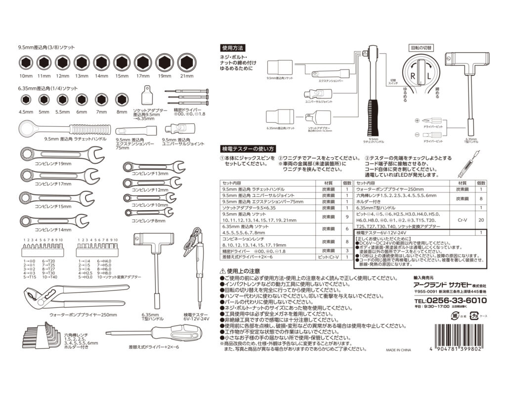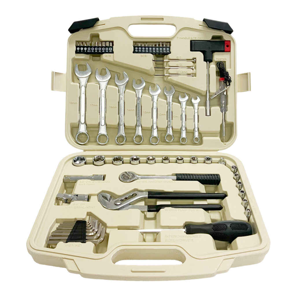 コンビネーションレンチ・ラチェットレンチ・各種ドライバーピットのほかにウォーターポンププライヤーや検電テスターなども入れた充実セットです。