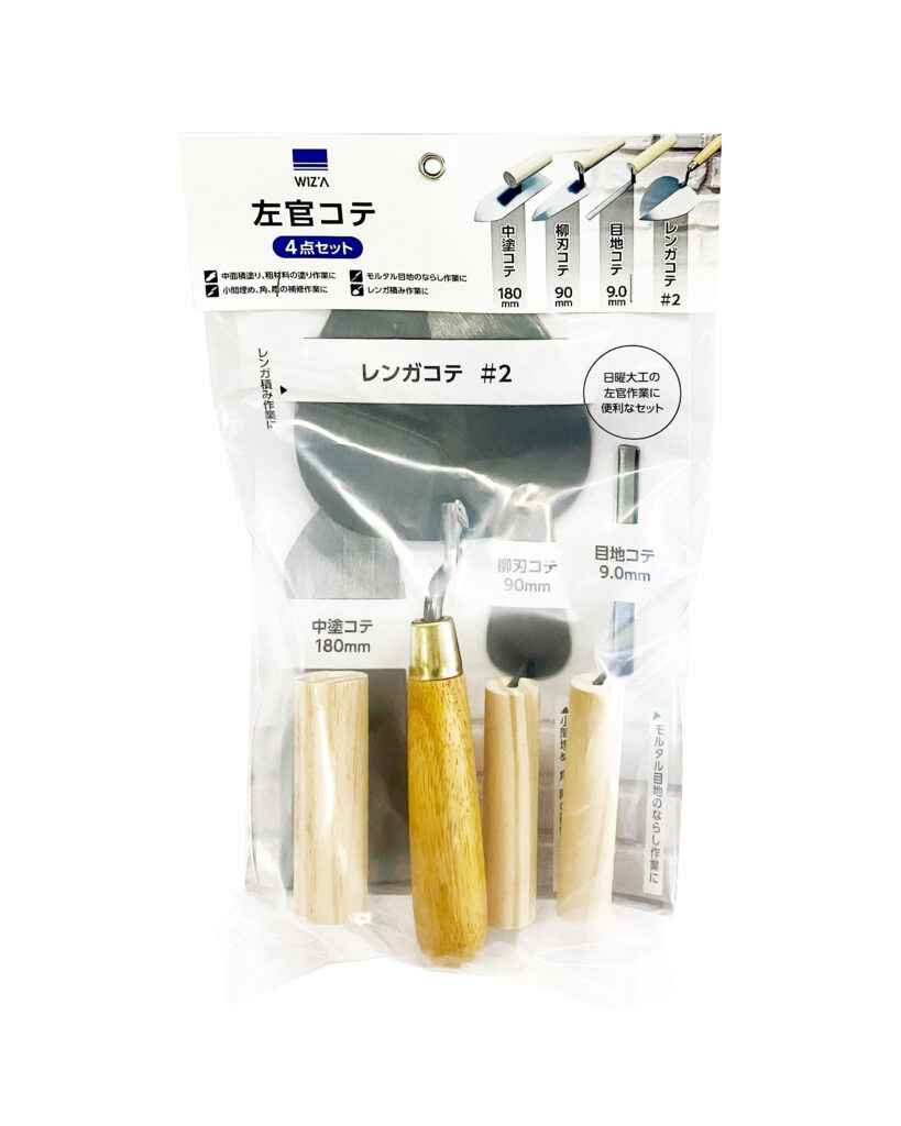 左官作業でよく使う中塗コテ、柳刃コテ、目地コテ、レンガコテをセットにしました。