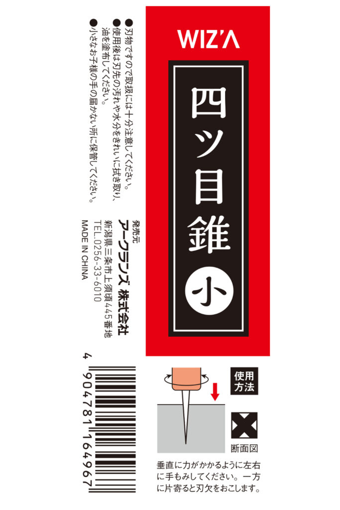 四ッ目錐 小 2024 8/15 WIZ'A 2024.08.15 × 四ッ目錐 小 ブランド:WIZ'A JANコード:4904781164967商品コード:134034規格・品番:-商品サイズ(mm)縦240 x 横17 x 高さ17重さ(g)24仕様用途:木材の下穴作業、薄板の穴あけ 柄:木柄 サイズ:小商品コメント昔ながらの工作の必需品。同じカテゴリーの商品豆平鉋 ウラ金付 42mm追入ノミ 15mm彫刻刀 丸刀 6.0mm細工ノミ 丸曲り 15mmセール針 穴付き 2本組 2.0×75mm彫刻刀 平刀 6.0mm革針 2本組 2.0×75mm三ッ目錐 小 WIZ'A 三ッ目錐 大 四ッ目錐 中