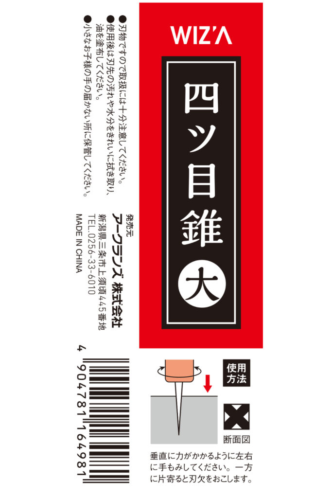 四ッ目錐 大 2024 8/15 WIZ'A 2024.08.15 × 四ッ目錐 大 ブランド:WIZ'A JANコード:4904781164981商品コード:134036規格・品番:-商品サイズ(mm)縦325 x 横17 x 高さ17重さ(g)30仕様用途:木材の下穴作業、薄板の穴あけ 柄:木柄 サイズ:大商品コメント昔ながらの工作の必需品。同じカテゴリーの商品彫刻刀 際刀 3.0mm追入ノミ 18mmDIY用のみ 貫通タイプ 3本組 彫刻刀 平刀 7.5mm彫刻刀 丸刀 9.0mm三ッ目錐 中 彫刻刀 際刀 7.5mm四ッ目錐 中 WIZ'A 四ッ目錐 中 サヤ入切出し 木柄 全鋼 60mm WB-300