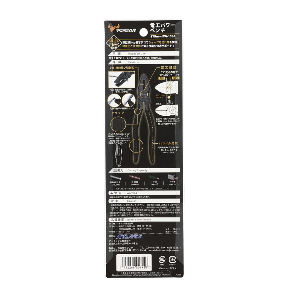電工パワーペンチ 175mm PW-103A 2024 8/15 WIZ'A 2024.08.15 × 電工パワーペンチ 175mm PW-103Aブランド:WIZ'A JANコード:4952269907926商品コード:233440規格・品番:PW-103A 商品サイズ(mm)縦187 x 横40 x 高さ12重さ(g)260仕様用途:ケーブル線、線材の切断 偏芯タイプで切断力UP商品コメントカシメ部を下に付けて軽い力で切断。同じカテゴリーの商品マイクロペンチ スプリング付 WZP-125Fレスキューペンチ 160mm WZ-RC160P パワーペンチ 圧着式 200mm GTP-200P電工パワーニッパー強力刃 200mm PW-324Aパワーニッパ 圧着式 150mm GTN-150PWIZA ブラックペンチ175mm WIZA ブラックペンチ200mm 電工パワーニッパー薄刃 225mm PW-305A WIZ'A パワー強力ニッパー 160mm PW-302A 電工パワーペンチ 200mm PW-104A