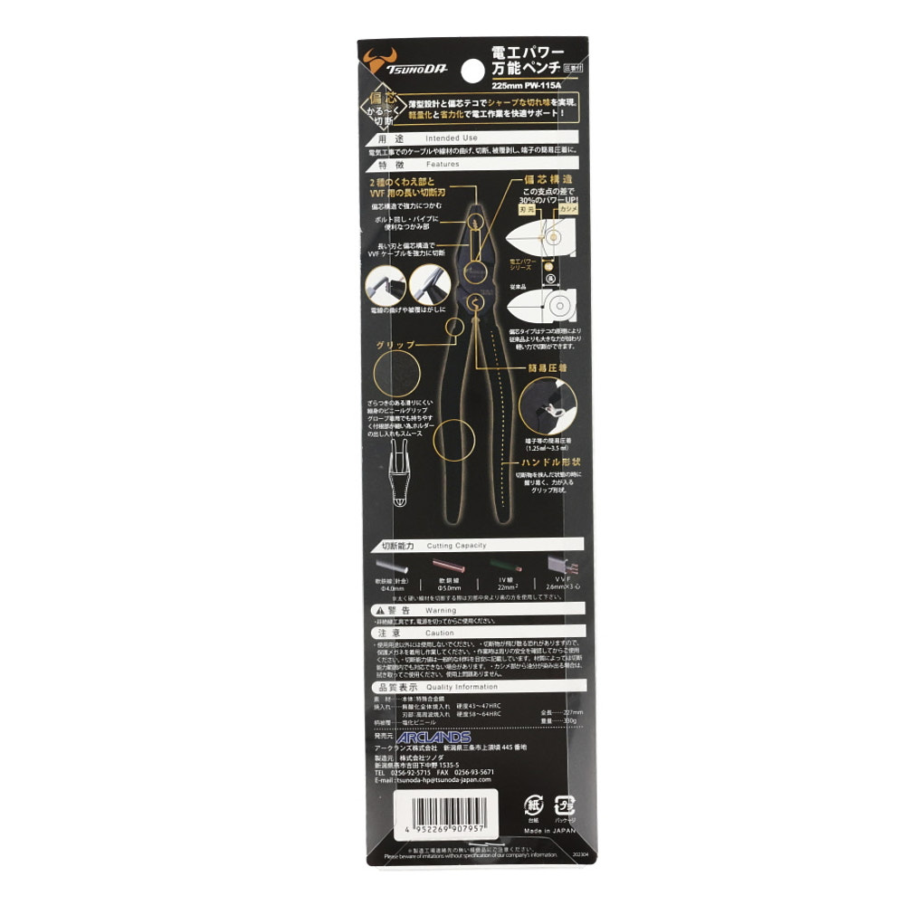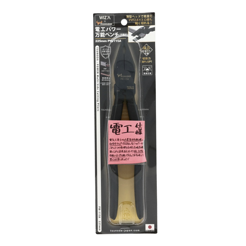 電工パワー万能ペンチ225mm PW-115A 2024 8/15 WIZ'A 2024.08.15 × 電工パワー万能ペンチ225mm PW-115Aブランド:WIZ'A JANコード:4952269907957商品コード:233443規格・品番:PW-115A 商品サイズ(mm)縦227 x 横50 x 高さ12重さ(g)330仕様用途:ケーブル線、線材の切断、簡易圧着 偏芯タイプで切断力UP商品コメントカシメ部を下に付けて軽い力で切断。同じカテゴリーの商品マイクロペンチ 125mm GTP-125M電工パワーニッパー薄刃 200mm PW-334A電工Fペンチ 195mm DF-195A先曲ロングノーズプライヤー 145mm GTBP-145Mパワー万能ラジオペンチ 150mm GTR-150Pスナップリングプライヤーセット WZ-SP4電工Fペンチ 220mm DF-220A マイクロペンチ スプリング付 WZP-125F WIZ'A 電工パワー万能ペンチ200mm PW-114A 電工パワーニッパー薄刃 160mm PW-332A
