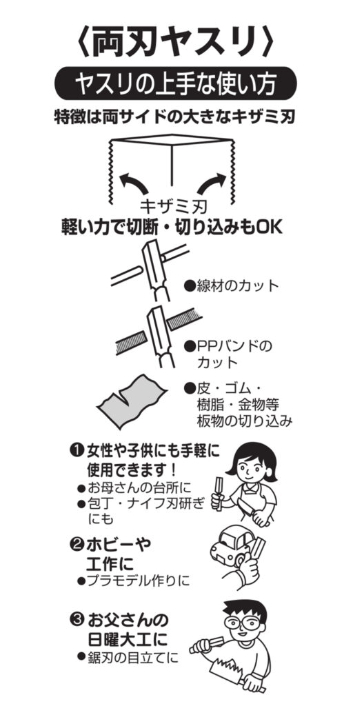 両刄ヤスリ ノコ刃目立用 柄なし 100mm 2024 8/15 WIZ'A 2024.08.15 × 両刄ヤスリ ノコ刃目立用 柄なし 100mmブランド:WIZ'A JANコード:4904781169924商品コード:279002規格・品番:-商品サイズ(mm)縦139 x 横20 x 高さ3重さ(g)28仕様用途:のこぎりの目立て用ヤスリ ヤスリ形状 ひし形 ヤスリ部長さ100mm ハンドル無し商品コメント高品質な日本製。同じカテゴリーの商品ダイヤモンドヤスリ 215mm 半丸 17-3木彫用ヤスリ グリップ付 8型 半丸 極細目 200mm 木彫用ヤスリ グリップ付 8型 平 極細目 200mm 鉄工ヤスリ 鉄材加工用 木柄付 半丸 中目 200mm鉄工ヤスリ 鉄材加工用 柄なし 半丸 中目 250mm両刄ヤスリ ノコ刃目立用 木柄付 100mmダイヤモンドヤスリ 215mm 曲 17-2鉄工用ヤスリ 鉄材加工用 柄なし 平 荒目 200mm WIZ'A 両刄ヤスリ ノコ刃目立用 柄なし 75mm 両刄ヤスリ ノコ刃目立用 柄なし 125mm
