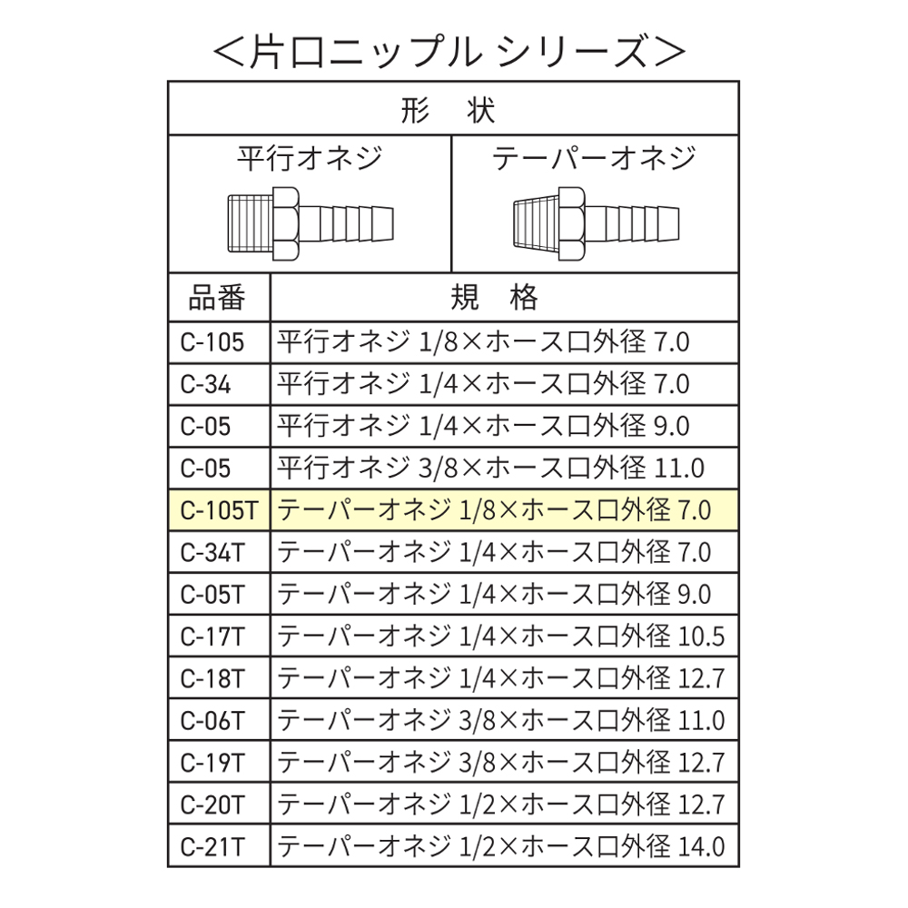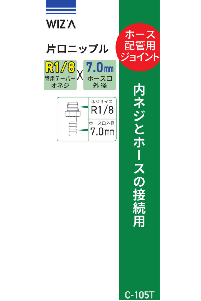 片口ニップル 7.0mm R1/8 C-105T 2024 8/15 WIZ'A 2024.08.15 × 片口ニップル 7.0mm R1/8 C-105T ブランド:WIZ'A JANコード:4904781061662商品コード:293653規格・品番:C-105T 商品サイズ(mm)-重さ(g)-仕様用途:内ネジパイプとホースの接続用 ホース外径:7.0mm ねじサイズ:テーパーオネジ:R1/8商品コメント内ねじパイプとホースの接続に。同じカテゴリーの商品エアープラグ テーパーオネジ R1/2 WZ-24PMエルボ 内ネジ Rc1/8 MC-80T エアープラグ ホース接続用 1/4 ホース9mm WZ-22PHエアープラグ テーパーオネジ R1/8 WZ-21PM ワンタッチソケット 平行メネジ G1/4 WZ-22SFFチーズ 三方内ネジ Rc3/8 MC-88Tエアープラグ テーパーオネジ R3/8 WZ-23PMエアープラグ ホース接続用 1/8 ホース7mm WZ-21PH WIZ'A 中間ブッシング 異径 R3/8×Rc1/8 C-62T 片口ニップル 7.0mm R1/4 C-34T