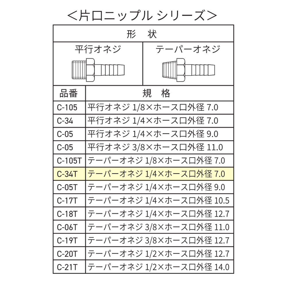 片口ニップル 7.0mm R1/4 C-34T 2024 8/15 WIZ'A 2024.08.15 × 片口ニップル 7.0mm R1/4 C-34Tブランド:WIZ'A JANコード:4904781072668商品コード:293654規格・品番:C-34T 商品サイズ(mm)-重さ(g)-仕様用途:内ネジパイプとホースの接続用 ホース外径:7.0mm ねじサイズ:テーパーオネジ:R1/4商品コメント内ねじパイプとホースの接続に。同じカテゴリーの商品エアープラグ ホース接続用 1/8 ホース7mm WZ-21PHワンタッチソケット ホース接続用 1/8 ホース7mm WZ-21SHワンタッチソケット テーパーメネジ Rc1/4 WZ-22SF中間ニップル ネジ交換用ソケット R1/4×G1/4 C-29Tエアーソフトホース 8.0×12.5mm 20m GTS8012-20 片口ニップル 10.5mm R1/4 C-17Tボール式エアーコック R1/4Xチューブ6.0mm D-09 コイルエアーホース ワンタッチカプラ付き 5mm×8mm 3m GT5080―3 WIZ'A 片口ニップル 7.0mm R1/8 C-105T 片口ニップル 9.0mm R1/4 C-05T