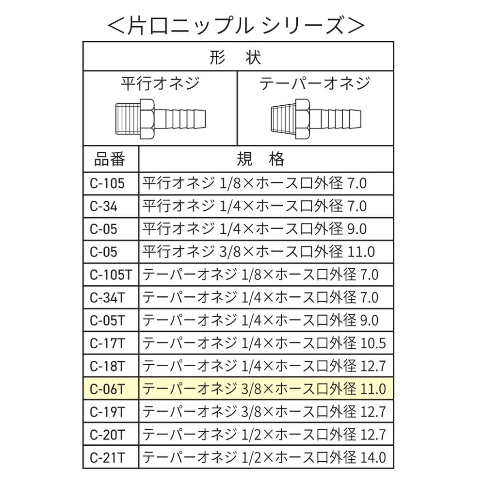 片口ニップル 11.0mm R3/8 C-06T 2024 8/15 WIZ'A 2024.08.15 × 片口ニップル 11.0mm R3/8 C-06Tブランド:WIZ'A JANコード:4904781072682商品コード:293656規格・品番:C-06T 商品サイズ(mm)-重さ(g)-仕様用途:内ネジパイプとホースの接続用 ホース外径:11.0mm ねじサイズ:テーパーオネジ:R3/8商品コメント内ねじパイプとホースの接続に。同じカテゴリーの商品エアーソフトホース 8.0×12.5mm 20m GTS8012-20 エルボ 内・外ネジ Rc1/4×R1/4 MC-84T中間ニップル 異径 R1/8×R 1/4 C-109Tエアーソフトホース 6.5×10.7mm 20m GTS6510-20 ワンタッチソケット テーパーメネジ Rc1/8 WZ-21SF片口ニップル 12.7mm R1/2 C-2T中間ニップル ネジ交換用 R1/4×G1/4 C-26T中間ニップル ネジ交換用ソケット R1/4×G1/4 C-29T WIZ'A 片口ニップル 9.0mm R1/4 C-05T 中間ニップル 同径 R1/8 C-107T