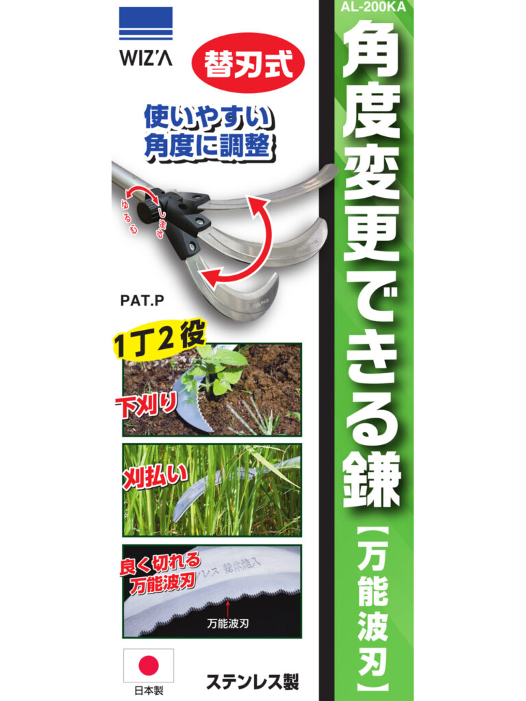 角度変更できる 万能波刃鎌 AL-2KA 2024 9/12 WIZ'A 2024.09.12 × 角度変更できる 万能波刃鎌 AL-2KAブランド:WIZ'A JANコード:4904781683376商品コード:720131規格・品番:ALー2KA 商品サイズ(mm)縦1,210 x 横165 x 高さ25重さ(g)265仕様用途:除草作業 替刃式 使いやすい角度に調整可能 サビにくいステンレス製商品コメント下刈り、刈払い等の、除草作業に使用頂けます。同じカテゴリーの商品片刃木鎌 鋼付 165mm首長ねじり鎌 鋼付 刃渡り120mm2段伸縮柄 草刈ピーラー ワイド AL-40WSA小枝打鎌 尺6 コブ柄 135mm角度変更できる 万能草刈鎌 替刃角度変更できる 万能草刈鎌 AL-3KA超軽量 サクサク草刈鎌 ワイド 1200mm柄 ALー3WA 首長ネジリ鎌 鋼付 WIZ'A ハンドルがはずせる ポット 16cm 激強ペン先マーカー 中字 レッド WZPM-RE