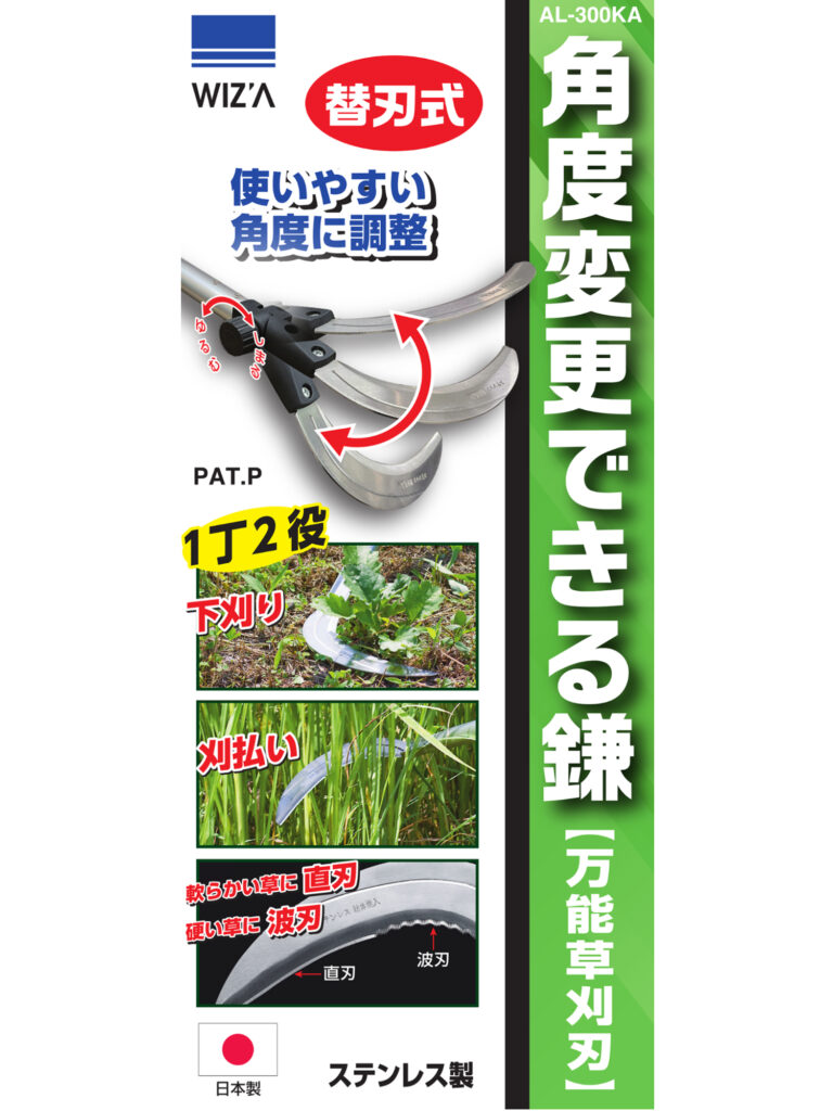 角度変更できる 万能草刈鎌 AL-3KA 2024 9/12 WIZ'A 2024.09.12 × 角度変更できる 万能草刈鎌 AL-3KAブランド:WIZ'A JANコード:4904781683383商品コード:720132規格・品番:ALー3KA 商品サイズ(mm)縦1,230 x 横195 x 高さ25重さ(g)305仕様用途:除草作業 替刃式 使いやすい角度に調整可能 サビにくいステンレス製商品コメント下刈り、刈払い等の、除草作業に使用頂けます。同じカテゴリーの商品軽量刈払鎌 195mm 600mm柄片刃薄鎌 鋼付 左利き用 180mm小鎌 ステンレス 120mm 2段伸縮柄 草刈ピーラー スリム AL-40SSA片刃中厚鎌 鋼付 180mm角度変更できる 万能波刃鎌 AL-2KA2段伸縮柄 草刈ピーラー ワイド AL-40WSAワンタッチ草抜き ロング刃 30mm WTー2SA WIZ'A ワンタッチ草抜き ワイド刃 80mm WTー3LA 草削りレーキ KP-1A