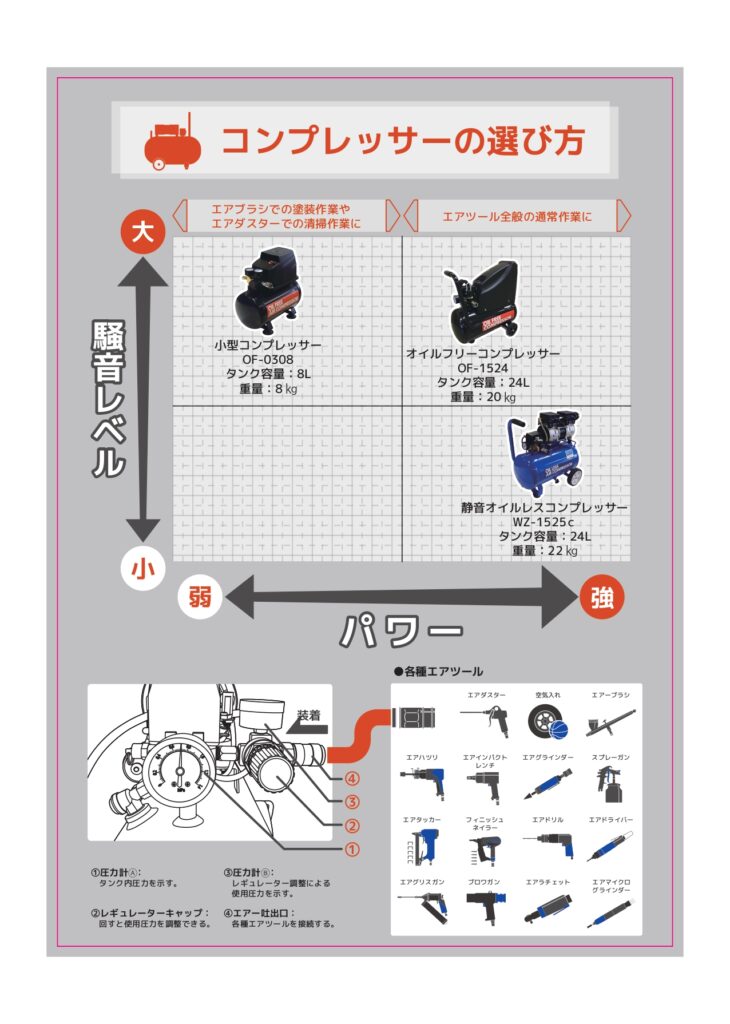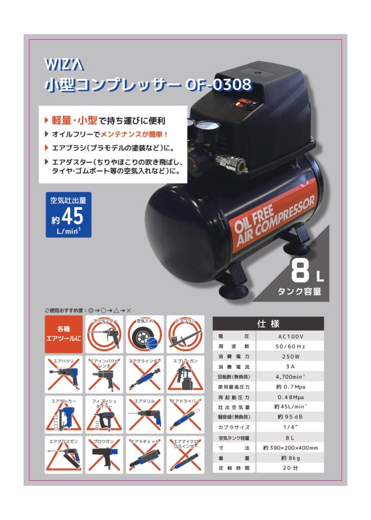 用途:エアーブラシ、エアーダスター、空気入れ
