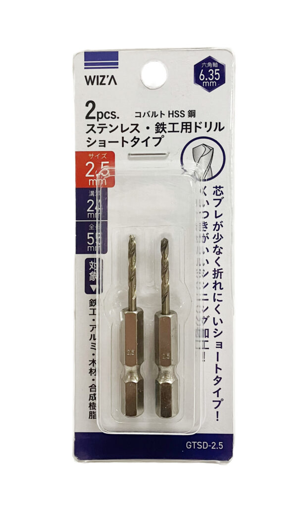 六角軸 ショート ステンレス・鉄工用ドリル 2PC 2.5mm GTSD-2.5