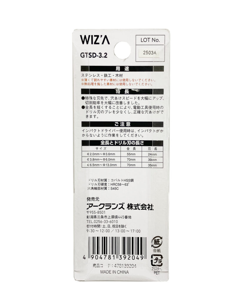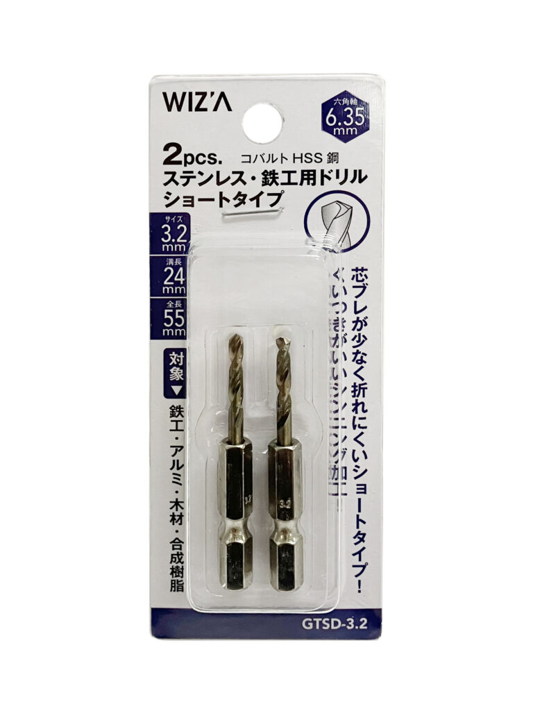 六角軸 ショート ステンレス・鉄工用ドリル 2PC 3.2mm GTSD-3.2