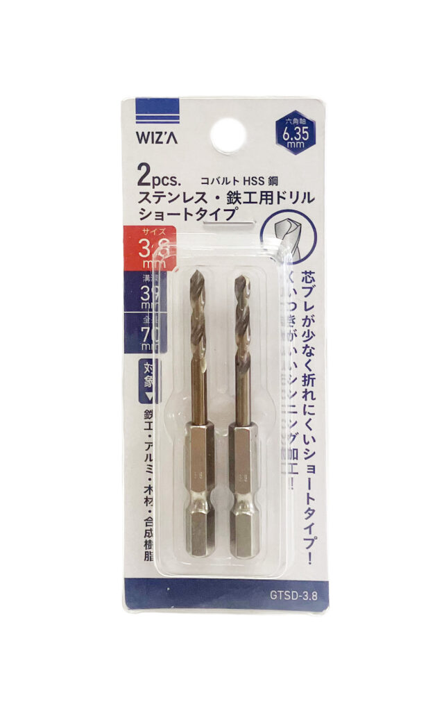 六角軸 ショート ステンレス・鉄工用ドリル 2PC 3.8mm GTSD-3.8