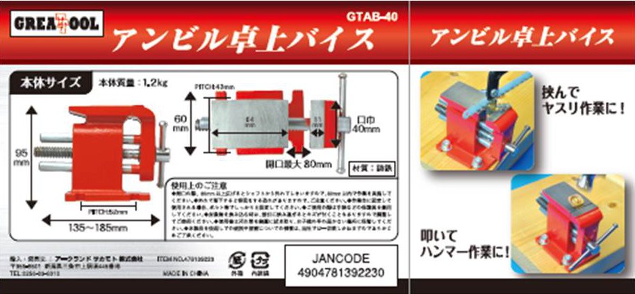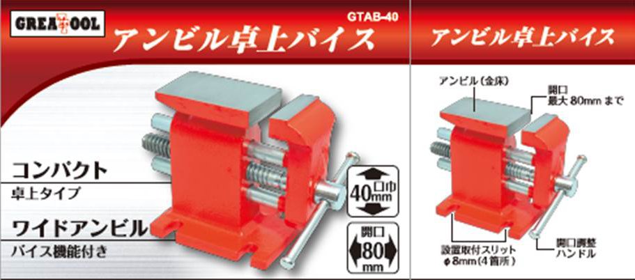 アンビル付 卓上バイス GTAB-40 2024 8/15 WIZ'A 2024.08.15 × アンビル付 卓上バイス GTAB-40ブランド:WIZ'A JANコード:4904781392230商品コード:478139223規格・品番:GTAB-40商品サイズ(mm)縦135 x 横95 x 高さ60重さ(g)1,200仕様用途:物を固定し、金属他の加工作業 口巾:40mm 口開巾:80mm アンビル部サイズ:40X64+40X11mm商品コメント小さなサイズでDIY用の必需品。同じカテゴリーの商品アルミ製 C型クランプ 25mm Cクランプ 深型 75mm WZ-DC75 バイスグリップ プライヤー 平 200mmクイックバークランプ 100mm GTQ-C100L型クランプ 保護キャップ付 1200mm GTLC-1200 バネクランプ 50mm WZ-SC50R クイックバークランプ 150mm GTQC-150L型クランプ 保護キャップ付 100mm GTLC-100 WIZ'A 豆アンビルツノ付 GTTA-05 ミニホームバイス 50mm アンビル付 GTMH-50