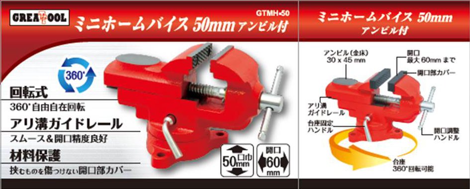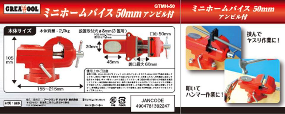 ミニホームバイス 50mm アンビル付 GTMH-50 2024 8/15 WIZ'A 2024.08.15 × ミニホームバイス 50mm アンビル付 GTMH-50ブランド:WIZ'A JANコード:4904781392247商品コード:478139224規格・品番:GTMH-50商品サイズ(mm)縦155 x 横105 x 高さ90重さ(g)2,000仕様用途:物を固定し、金属他の加工作業 口巾:50mm 口開巾:60mm アンビル部サイズ:45X30mm商品コメント小さなサイズでDIY用の必需品。同じカテゴリーの商品L型クランプ 保護キャップ付 200mm GTLC-200バイスグリップ プライヤー 125mmナイロンバネクランプ 50×110mm GTSC-50 アルミ製 C型クランプ 25mm クイックバークランプ 300mm GTQC-300パワークランプ フリーガイド付 50mmイモノ製 C型クランプ 150mm アルミ製 C型クランプ 100mm WIZ'A アンビル付 卓上バイス GTAB-40 グルーガン用スティック 6本入り 透明