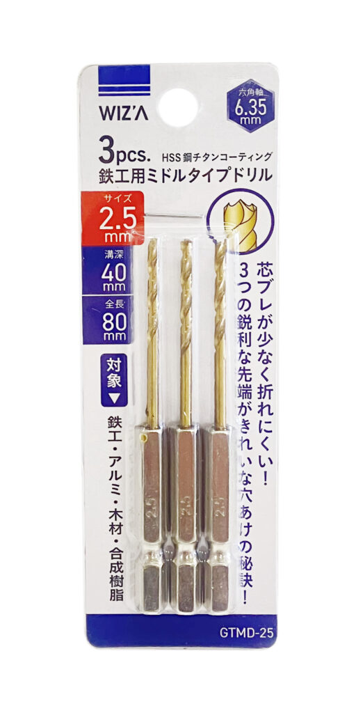 六角軸 鉄工用チタンドリル ミドルサイズ 3PC 2.5mm GTMD-25