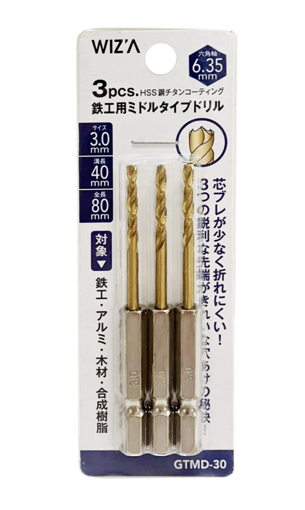 六角軸 鉄工用チタンドリル ミドルサイズ 3PC 3.0mm GTMD-30