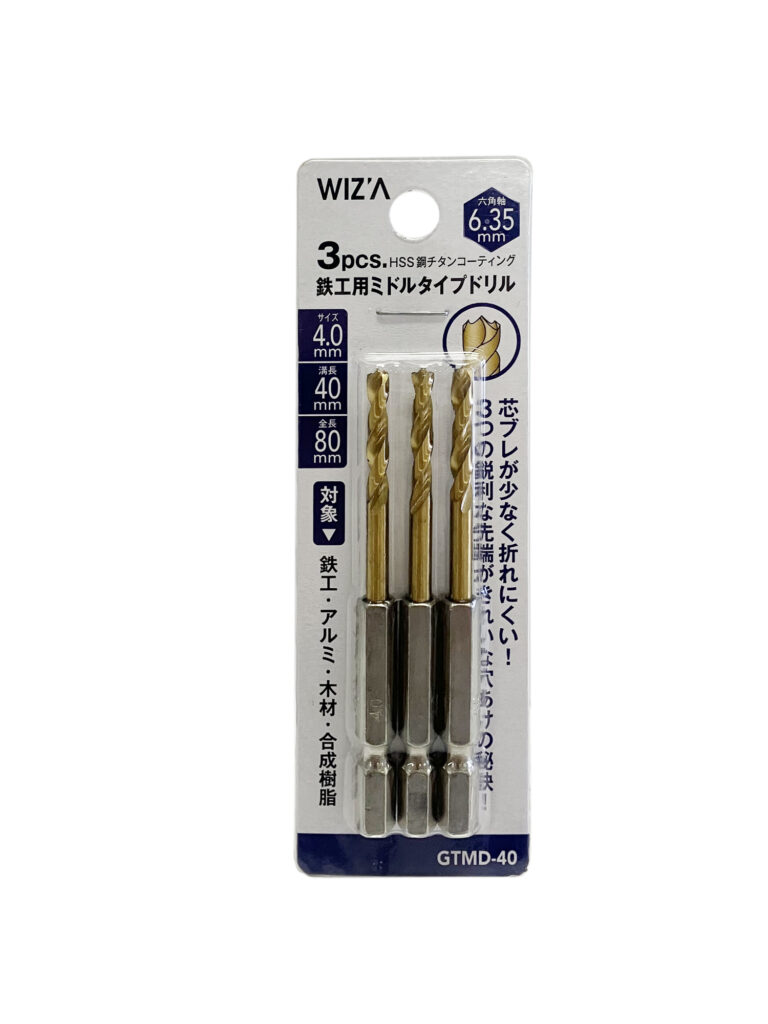 六角軸 鉄工用チタンドリル ミドルサイズ 3PC 4.0mm GTMD-40