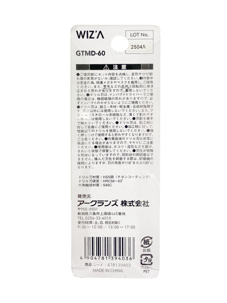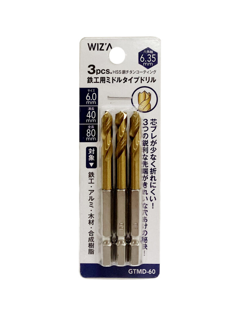 六角軸 鉄工用チタンドリル ミドルサイズ 3PC 6.0mm GTMD-60