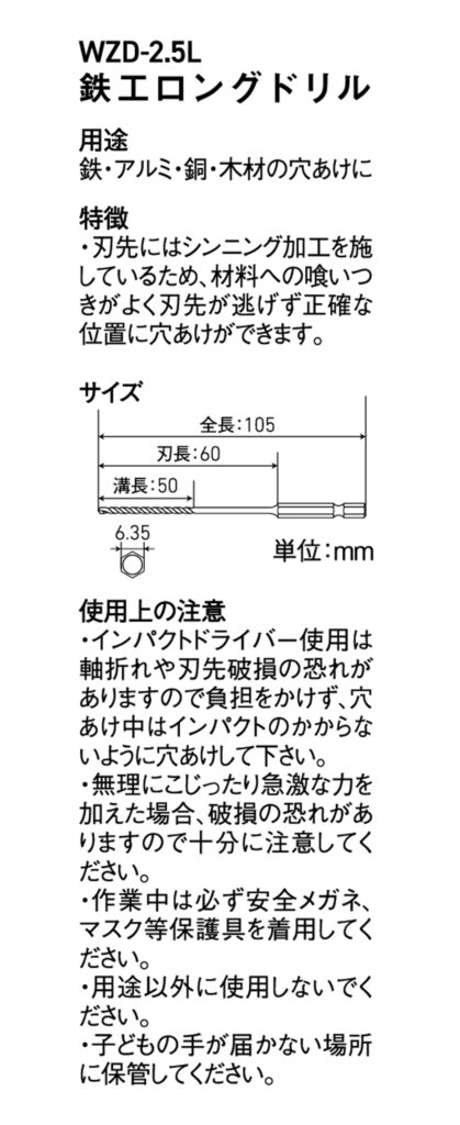 六各軸 鉄工用ロングドリル 2.5mm WZD-2.5L