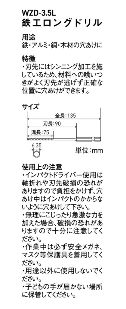 六各軸 鉄工用ロングドリル 3.5mm WZD-3.5L 2024 9/05 WIZ'A 2024.09.05 × 六各軸 鉄工用ロングドリル 3.5mm WZD-3.5Lブランド:WIZ'A JANコード:4904781396566商品コード:478139656規格・品番:WZD-3.5L商品サイズ(mm)縦135 x 横6 x 高さ6重さ(g)16仕様用途:鉄、アルミ、銅、木材の穴あけ ドリル刃径:3.5mm 全長:135mm 刃長:75mm商品コメント奥まった所の穴あけ、深い穴あけの時に使います。同じカテゴリーの商品チタンコーティング 鉄工用ドリル刃 3.5mm GTTD-35カラービット&コンクリートドリルセット 10PC WZ-BCO10六各軸 鉄工用ロングドリル 2.8mm WZD-2.8Lアルミ・銅用ドリル刃セット 10PC WZ-ACO10六角軸 鉄工用チタンドリル ミドルサイズ 3PC 6.0mm GTMD-60ステップドリル 四枚刃厚切 5段 WZ-DSD412六角軸 鉄工用ミドルサイズチタンドリル 10PC GTTM-10チタンコーティング 鉄工用ドリル刃 6.0mm GTTD-60 WIZ'A 六各軸 鉄工用ロングドリル 3.2mm WZD-3.2L 六各軸 鉄工用ロングドリル 3.8mm WZD-3.8L