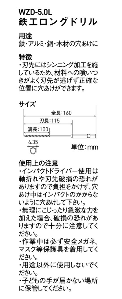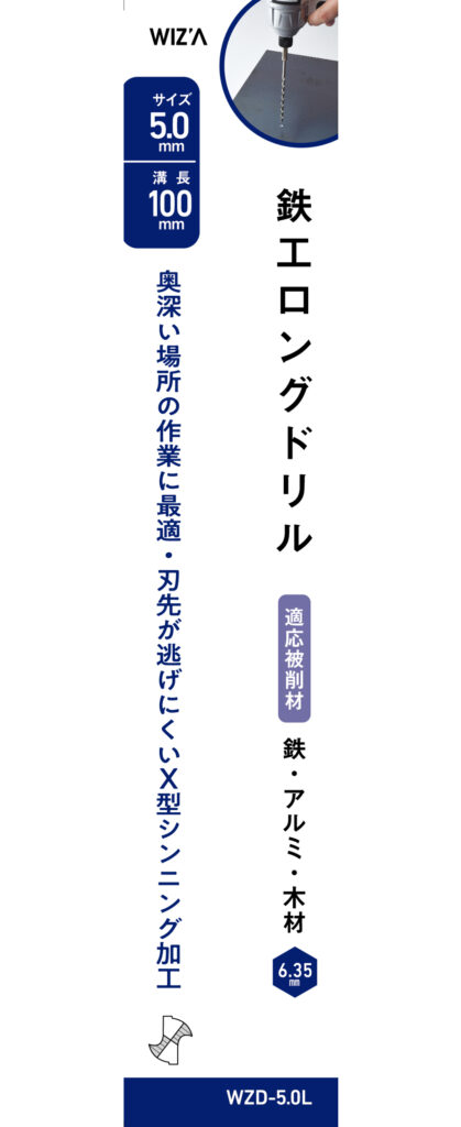 六各軸 鉄工用ロングドリル 5.0mm WZD-5.0L 2024 9/05 WIZ'A 2024.09.05 × 六各軸 鉄工用ロングドリル 5.0mm WZD-5.0Lブランド:WIZ'A JANコード:4904781396610商品コード:478139661規格・品番:WZD-5.0L商品サイズ(mm)縦160 x 横6 x 高さ6重さ(g)20仕様用途:鉄、アルミ、銅、木材の穴あけ ドリル刃径:5.0mm 全長:160mm 刃長:100mm商品コメント奥まった所の穴あけ、深い穴あけの時に使います。同じカテゴリーの商品六角軸 鉄工用ドリル 4.2mm WZ-7ID-4.2チタンコーティング 鉄工用ドリル刃 2.5mm GTTD-25六角軸 鉄工用チタンドリル ミドルサイズ 3PC 2.8mm GTMD-28六角軸 ショート ステンレス・鉄工用ドリル 2PC 5.5mm GTSD-5.5六角軸 ショート ステンレス・鉄工用ドリル 11.0mm GTSD-11.0六角軸 鉄工用ドリル 4.0mm WZ-7ID-4.0チタンコーティング 鉄工用ドリル刃 5.5mm GTTD-55六各軸 鉄工用ロングドリル 3.5mm WZD-3.5L WIZ'A 六各軸 鉄工用ロングドリル 4.5mm WZD-4.5L 六各軸 鉄工用ロングドリル 5.5mm WZD-5.5L