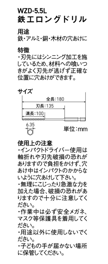 六各軸 鉄工用ロングドリル 5.5mm WZD-5.5L 2024 9/05 WIZ'A 2024.09.05 × 六各軸 鉄工用ロングドリル 5.5mm WZD-5.5Lブランド:WIZ'A JANコード:4904781396627商品コード:478139662規格・品番:WZD-5.5L商品サイズ(mm)縦180 x 横6 x 高さ6重さ(g)28仕様用途:鉄、アルミ、銅、木材の穴あけ ドリル刃径:5.5mm 全長:180mm 刃長:100mm商品コメント奥まった所の穴あけ、深い穴あけの時に使います。同じカテゴリーの商品鉄工用ドリル刃セット チタンコーティング 19PC GTTDS-19コバルトHSS鋼 10PC ステンレス用ドリル刃セット GTNSDS-10六角軸 鉄工用ドリル 3.2mm WZ-7ID-3.2チタンコーティング 鉄工用ドリル刃 3.8mm GTTD-38六角軸 鉄工用ショートタイプドリル刃セット チタンコーティング 10PC WZSD-10Tチタンコーティング 鉄工用ドリル刃 5.0mm GTTD-50六角軸 ショート ステンレス・鉄工用ドリル 2PC 5.5mm GTSD-5.5六角軸 鉄工用ドリル 3.5mm WZ-7ID-3.5 WIZ'A 六各軸 鉄工用ロングドリル 5.0mm WZD-5.0L 六各軸 鉄工用ロングドリル 6.0mm WZD-6.0L