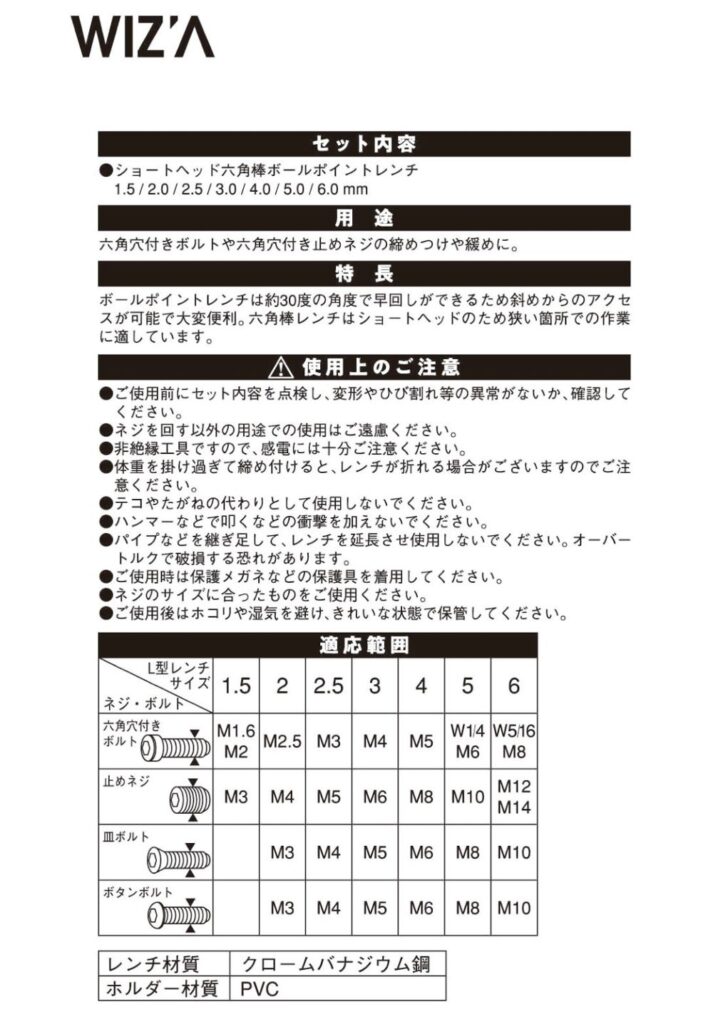 L型レンチサイズ:1.5、2.0、2.5、3.0、4.0、5.0、6.0mm