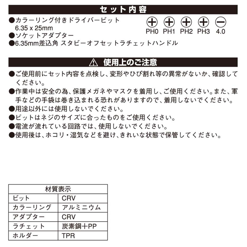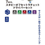 セット内容:カラーリング付きドライバービット、ソケットアダプター、スタビーオフセットラチェットハンドル
