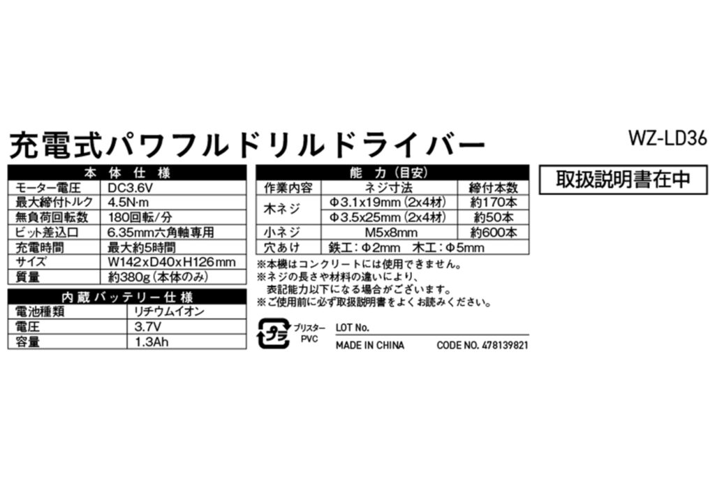充電式パワフルドリルドライバー 3.6V WZ-LD35