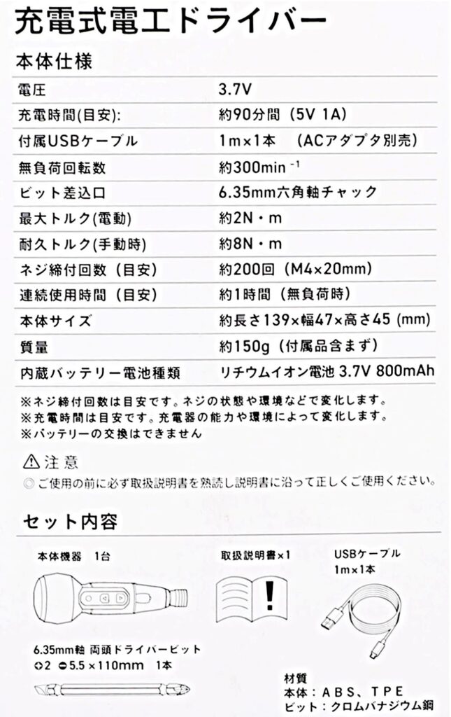 セット内容:本体、USBケーブル1m、両頭ドライバービット