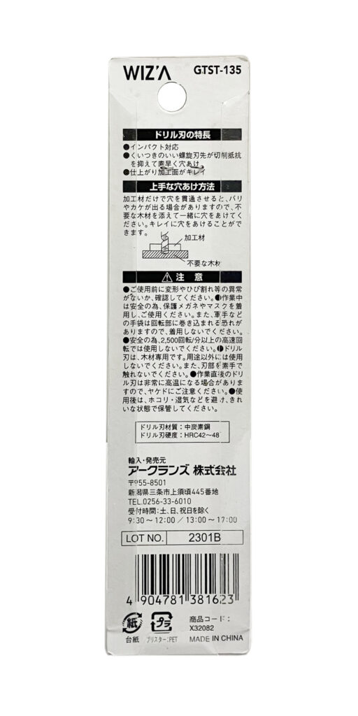 木工用ショートビット 13.5mm GTST-135 2024 9/05 WIZ'A 2024.09.05 × 木工用ショートビット 13.5mm GTST-135ブランド:WIZ'A JANコード:4904781381623商品コード:X32082 規格・品番:GTST-135商品サイズ(mm)-重さ(g)55仕様用途:木材の穴あけ ドリル刃径:13.5mm 刃長:60mm 刃先:螺旋タイプ商品コメント螺旋刃先が切削抵抗を抑えてすばやく穴あけ。 回転モードで使用して下さい。同じカテゴリーの商品六角軸 テーパー下穴錐 5.0mm R-5木工用ショートビット 8.0mm GTST-8木工用極短ドリルビット 12mm WZGM-12木工用極短ドリルビット セット 5本入り WZGM-5S木工用ショートビット 15.0mm GTST-15木工用ショートビット 5.0mm GTST-5六角軸 テーパー下穴錐 4.0mm R-4六角軸 木工ドリル刃セット 8PC GTWS-8HH WIZ'A 木工用ショートビット 13.0mm GTST-13 木工用ショートビット 15.0mm GTST-15