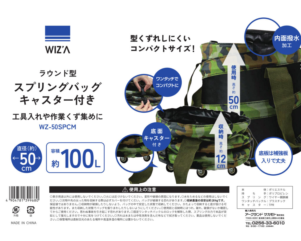 工具・道具の収納や、作業くず集めにご利用いただく、スプリングバッグです。