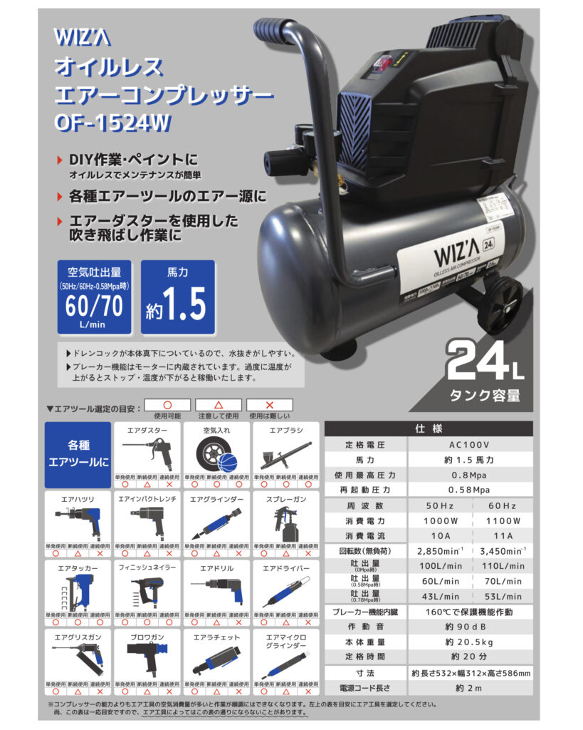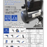 用途:タイヤの空気入れ、エアインパクトレンチでのタイヤ交換や車両整備、エアダスターやエアプローでの清掃作業、エアブラシやエアスプレーガンでの塗装作業、エアタッカーを使ってのステープル打ち込みなどの際に。